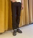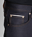 The Nightshade Stretch Selvedge is a 12oz Japanese selvedge denim with 2% stretch for extra comfort. The denim's color is created by adding a black dye to the indigo, resulting in a rich, almost black indigo hue. Other details include contrast stitching, a brown leather patch, a red selvedge ID, silver metallic buttons, and rivets.
